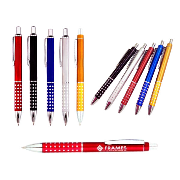 [vc_row][vc_column][vc_column_text]Description: Ball point pen with aluminum metal barrel. Jewel accents. Metallic sleek design barrel. Comfort grip design and Click mechanism. Imprint area 2″ x .25″. Medium point black or blue ink. Shipping Air included 1 location USA , Laser engrave Included.