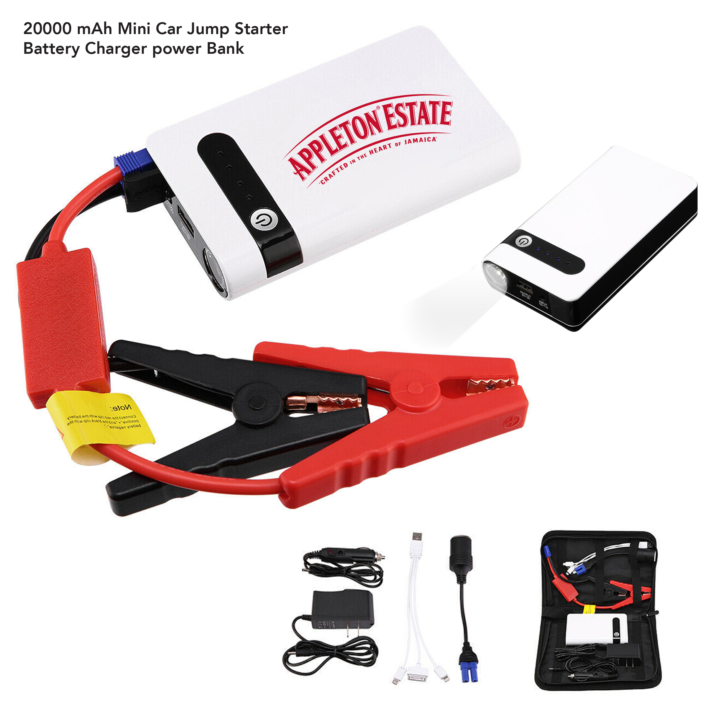 [vc_row][vc_column][vc_column_text]High-Quality portable car battery jump starter 20000mAh Lithium battery. Power bank for all your mobile USB devices with light in. Emergency Safety tool for any auto owner. Jump Starter is for Gasoline cars below 4.0L. It can start a V8. Not for Diesel. A single charge allows 15 starts. Portable Li-Ion battery pack for your electronic devices, Mini jumper cable clamps. High-quality Bright LED flashlight which lasts up to 40 hours with 1 charge the flashlight features an “SOS” Safety flashing option. USB output 2.1A port for fast charging 5 hours for a full charge. Adapter US plug, four-in-one USB charge adapter, instruction manual, zippered carrying case. Battery Charger size 5″x3″x1″ Logo imprint included on charger body. Price including 1 color imprint. Includes Air freight delivered.