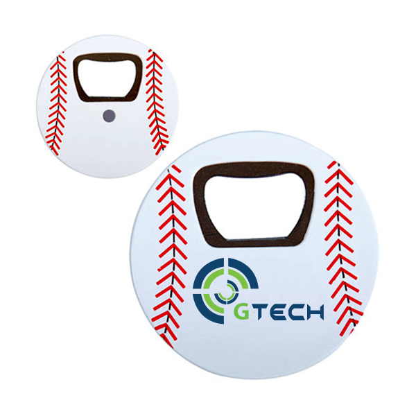 [vc_row][vc_column][vc_column_text]Baseball shaped round bottle beverage opener made of sturdy ABS and stainless steel Pre-printed red laces. Backside has a magnet to attach to metal surface refrigerator, tool bench. Size: 2 3/4 ” x 1/6 ”
