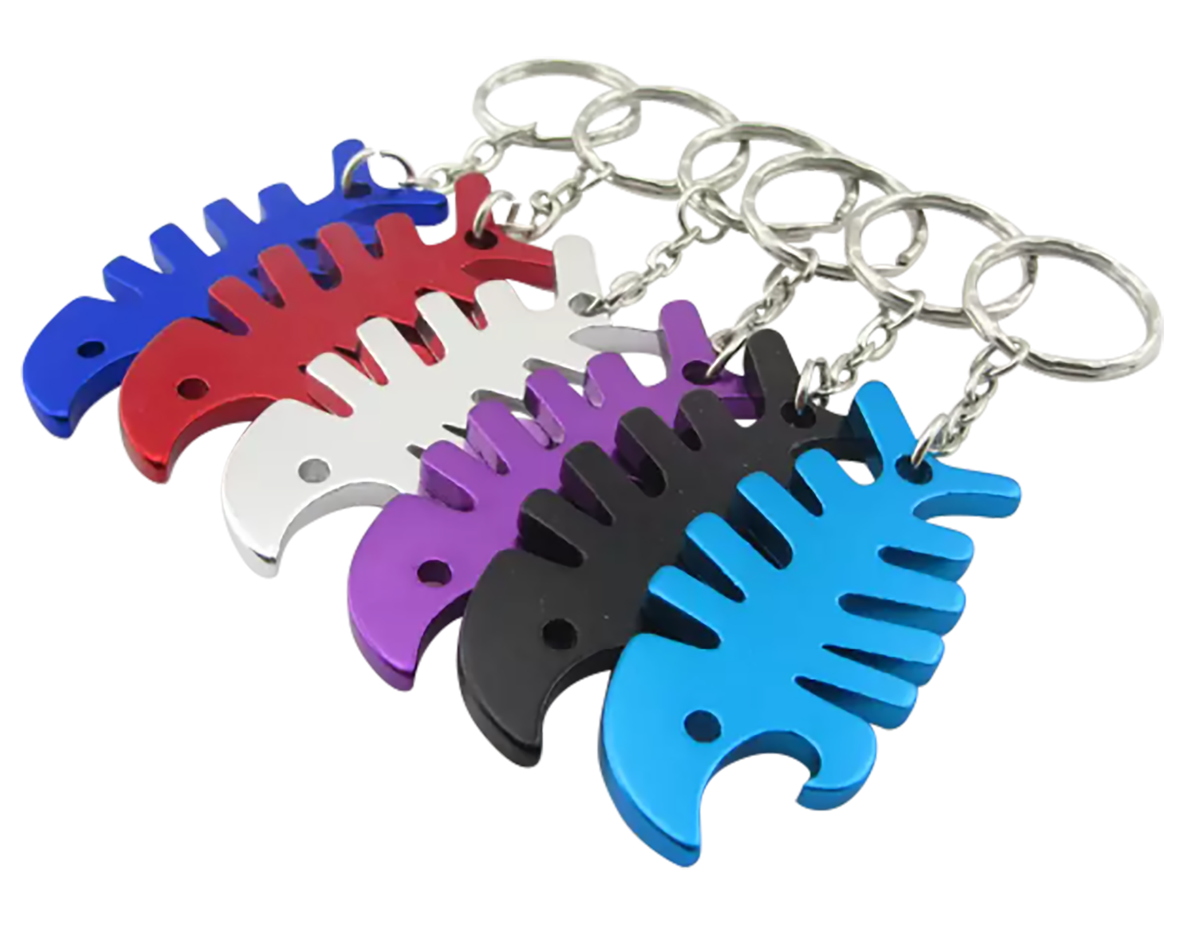 Fish bone shape aluminum bottle beer opener keychain. Includes Laser engraving or Printing. Made from anodized premium aluminum. Ideal Includes one color and one location imprint. Size 2.6’x1.1″ Weight Approx. 30 grams. Optional: keyring or Keyring chain. Blanks are available. FREE FREIGHT and Quick Production