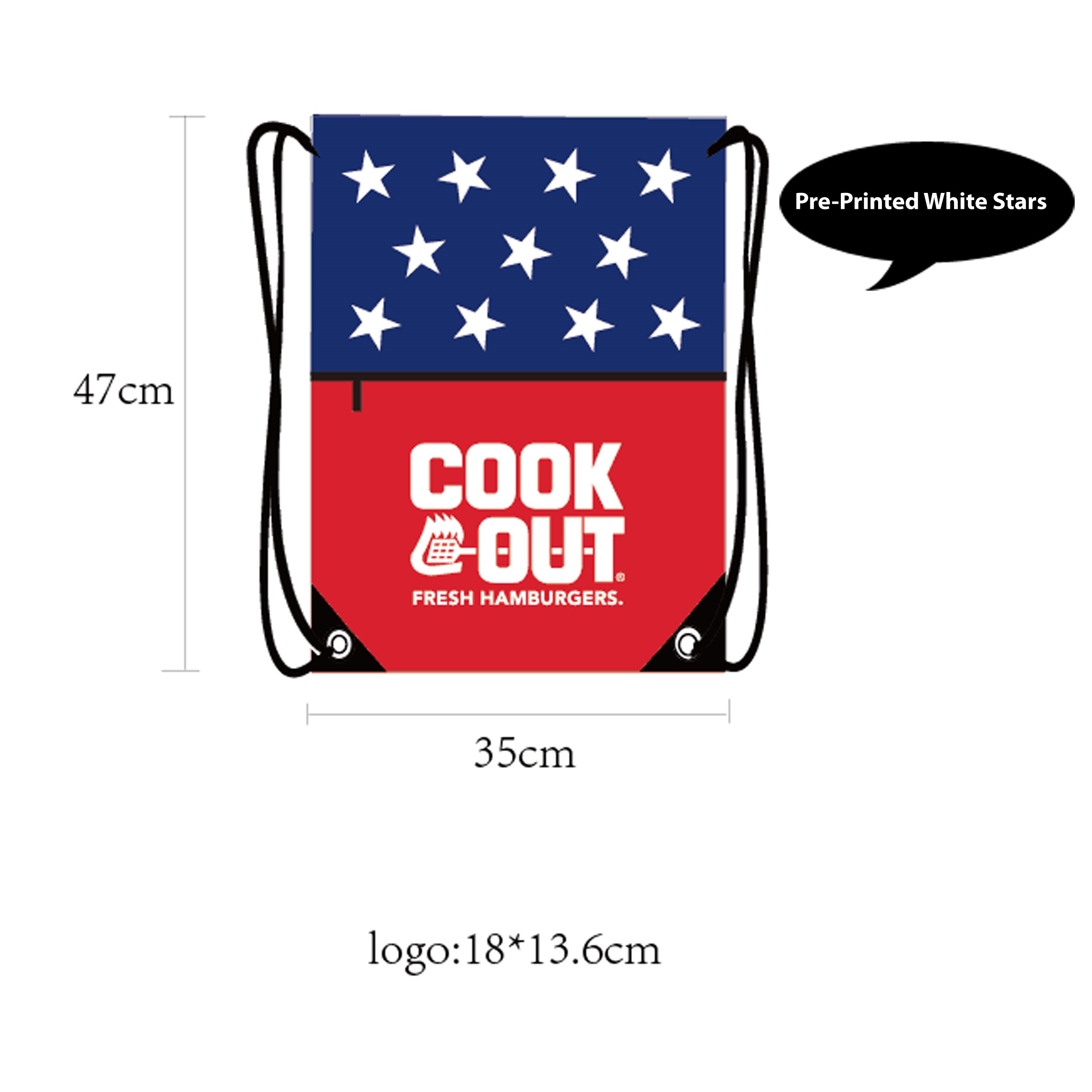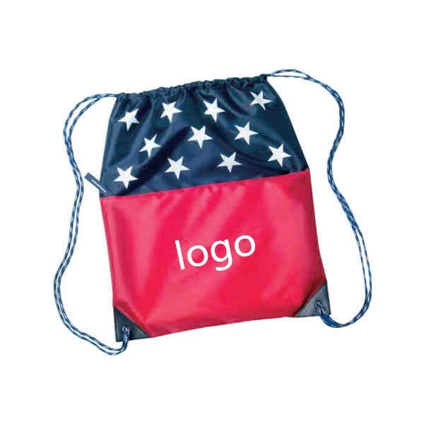 Description: Custom Red and Blue Drawstring sportspack back pack. Made of 210D polyester. Features drawstring cord closure and large outside zippered pocket. This bag is Pre-printed with white Stars. Size: 14 1/2″ x 18 1/2″ Great for any patriotic themed event, 4th of July,BBQ’s, Company picnics, holidays. Quick production and Delivery. Includes Air shipping and delivery Door to door. Price includes 1 color 1 location imprint.