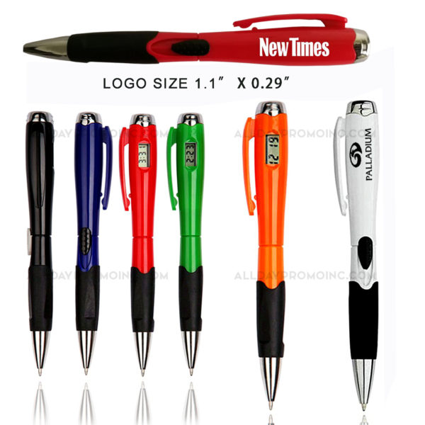 [vc_row][vc_column][vc_column_text]Ballpoint pen with a digital clock. Chrome trim and comfort grip. Slide-action pen function includes one AG3 button cell battery. Made of ABS. Ink colors: black, red, blue. Refill size 0.7 or 1.0 Color match 5000 pcs. Includes one-color one-location imprint. Price includes Air shipping delivery to one location in the USA. Door to door . Colors available per request.