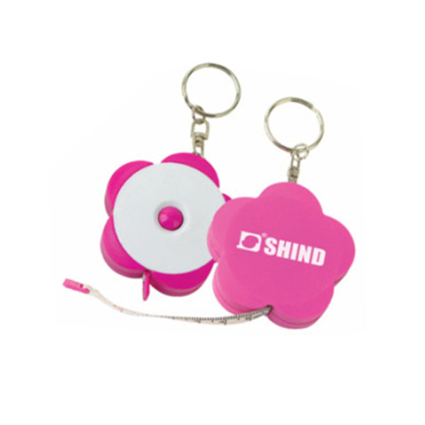 [vc_row][vc_column][vc_column_text]Flower shaped tape measure. 5ft long with inch and metric units imprinted. Pushing white button allows tape to retract . Tape blade is PVC fabric . Colors blue , Pink , green , red, purple .Size: 2 1/4″” x 2 1/4″” x 5/8″” Price includes 1 color 1 location imprint and air freight in US.
