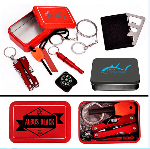 [vc_row][vc_column][vc_column_text]Complete Custom Outdoor Survival kit in Tin box. Available in Standard Red SOS or Customize the Stainless steel silver tin with your imprint. Survival Kit Includes: Firestarter, Emergency Aluminum Whistle, Mini compass, Multi-use tool with a pocket knife and Flashlight, Multi-functional metal lifesaving card, and a Hand wire saw. Useful items inside this compact tin box with a lid. Lightweight, durable, moisture-proof, compact size. Great for hiking, camping, hunting, outdoors, emergency, marine, and auto. SOS red tin is standard. Optional : Silver tin with your logo or graphic. Price Includes 1-color imprint on the tin box and survival tools inside. For Qtys over 1000 customize the content to your requirements. Price includes shipping by air DHL. Quick production and Delivery.