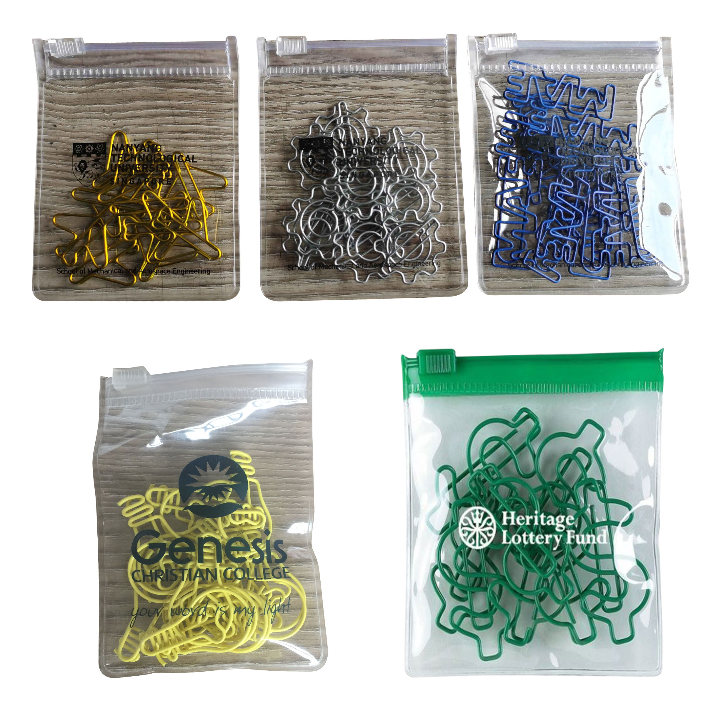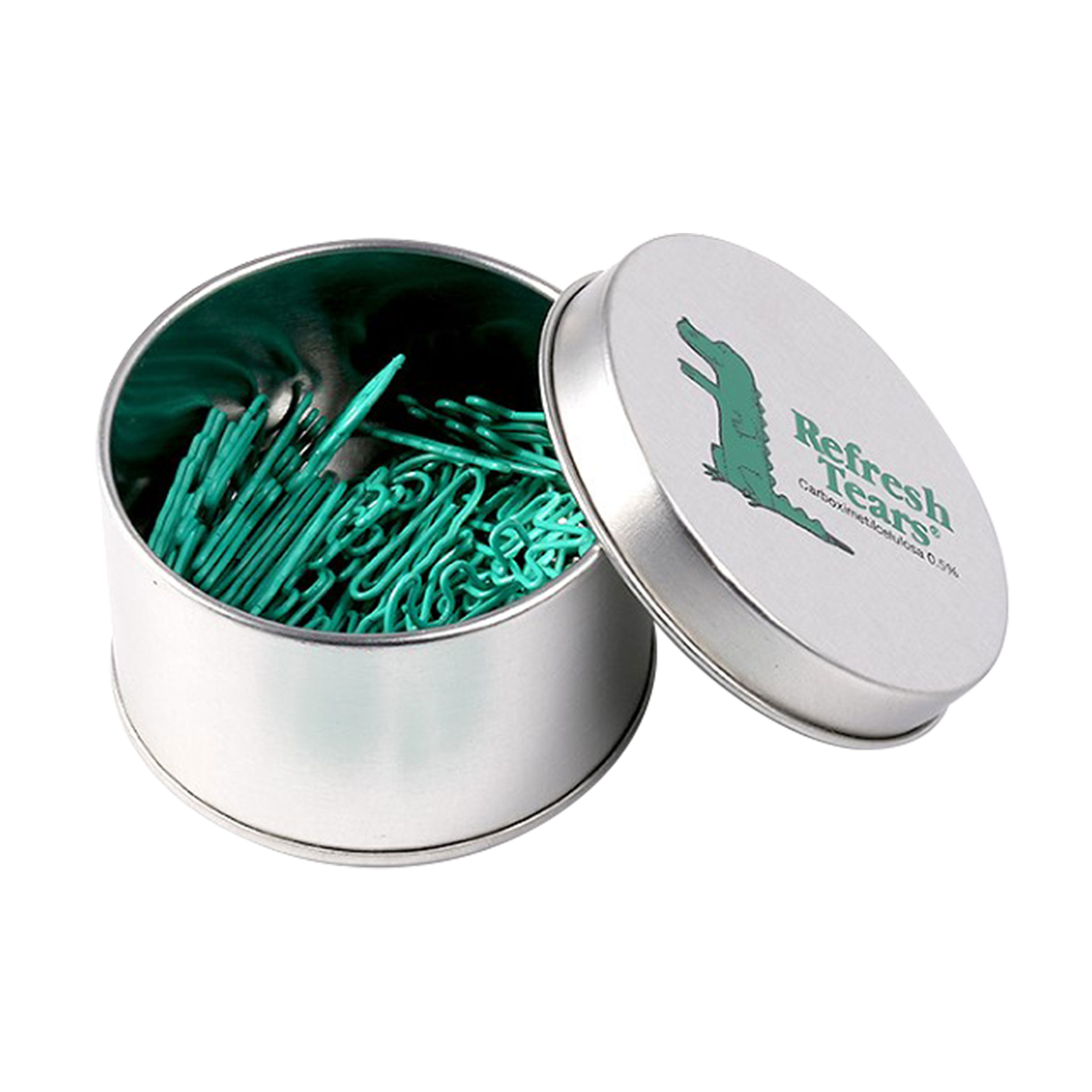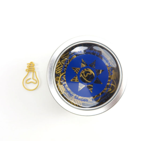 Light bulb shape, custom shape, or choose from our standard shapes. Coated metal paper clips that come in a round metal tin with a clear window lid or a solid lid. Includes 25-30 clips inside the tin container. Clips size: 0.75″ x1.38″ x 0.05″ – Round Tin Size: 2.56″ x 1.58″. We offer all different shapes of clips to choose from. Other packaging options Clear Zipper Pouch a round translucent container. No charge for PMS color for Clips. Price is based on a 1-color imprint on the clear window. Price includes shipping by air DHL door to door. Quick production and Delivery.