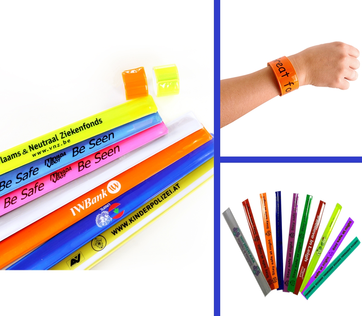 [vc_row][vc_column][vc_column_text]Hi-Visibility Reflective Snap band wristbands. Bright Neon Reflective with a smooth comfortable Flannette inside bracelet surface. These bracelets have a thin internal core that will snap around your wrist to create the snap. Be Seen in low light conditions with these Bright Neon Reflective Colors. Large area for imprint for graphics and logos. Size is 12″ x 1″ Other sizes are available. Fast Production and Delivery. Includes 1 color imprint. Price includes Air shipping to 1 location in USA . Ideal for festivals, Race event, safety events, outdoor promotions, fitness events, seniors