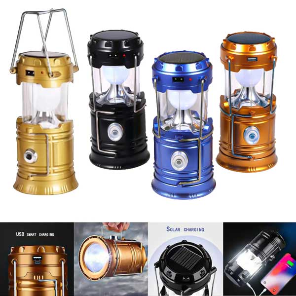 [vc_row][vc_column][vc_column_text]Portable LED Telescopic camping lantern with rechargeable batteries, solar charged or USB interface charge. Features LED area lighting and LED flashlight spotlight. Built-in solar charging six hours life on a full charge and battery bank with DC Port. The Lantern is a Multi-use light ideal for tents and outdoors the lantern can easily hang. Size 3.6″ l x 5.25″w. Lantern extended 7.6″ x 3.74″ Ideal for Home use, outdoors, camping,fishing. Logo imprint on side. Includes Free Air freight shipping delivered door to door . Colors: Black, Metallic Red, Gold , Blue.