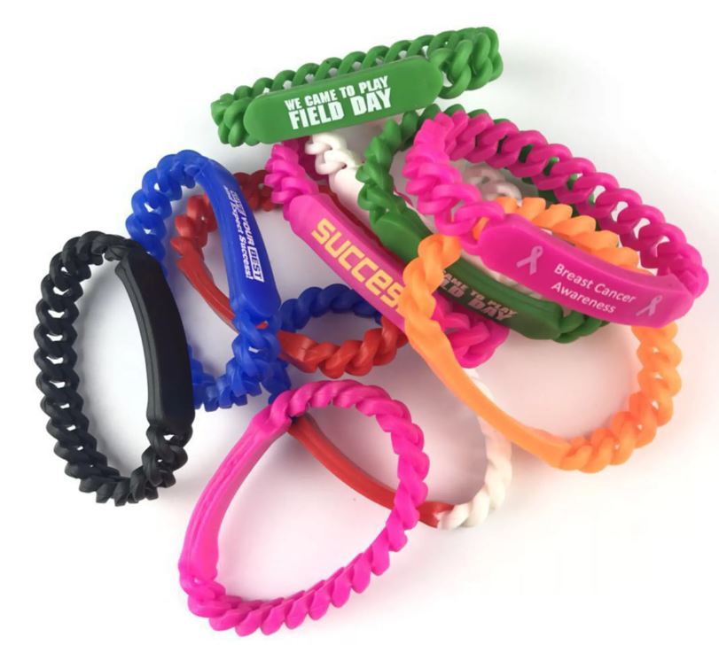 [vc_row][vc_column][vc_column_text]Eco-friendly Silicone wristband link bracelet. Designed to look like a twisted chain ID bracelet. Universal size to fit most. Soft comfortable fit. Comes in a variety of colors.  Ideal for conferences, school events, sports teams, tradeshows. Raise awareness for any campaign or cause including health awareness, team pride, fundraisers.  Includes 1 color imprint. Includes FREE Air shipping by air DHL Delivered . Quick Production and delivery.